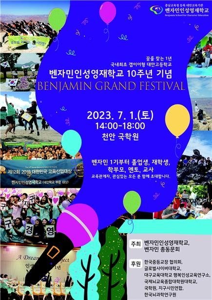 시험, 성적, 숙제, 학교건물, 교과서가 없는 세계 최초 5무 학교인 벤자민인성영재학교(교장 김나옥, 이하 벤자민학교)가 개교 10주년을 맞아 ‘벤자민 10주년 기념 그랜드 페스티벌’을 오는 7월 1일(토) 오후 2시부터 7시까지 충남 천안시 국학원에서 개최한다.