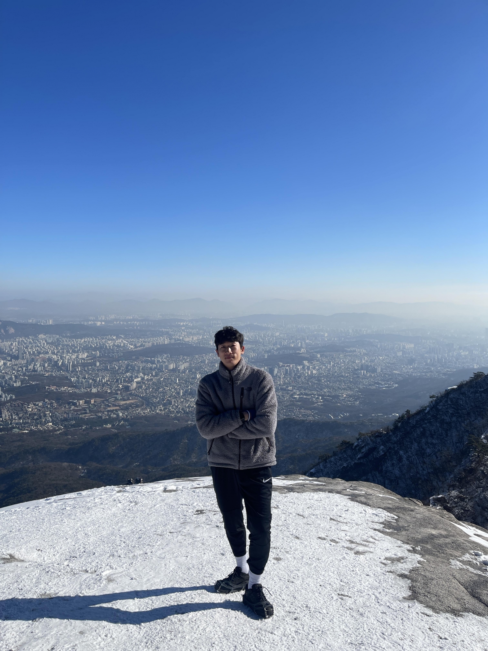 수원삼성 블루윙즈 주장, 골키퍼 양형모가 겨울 산 위에서 포즈를 취하고 있다.