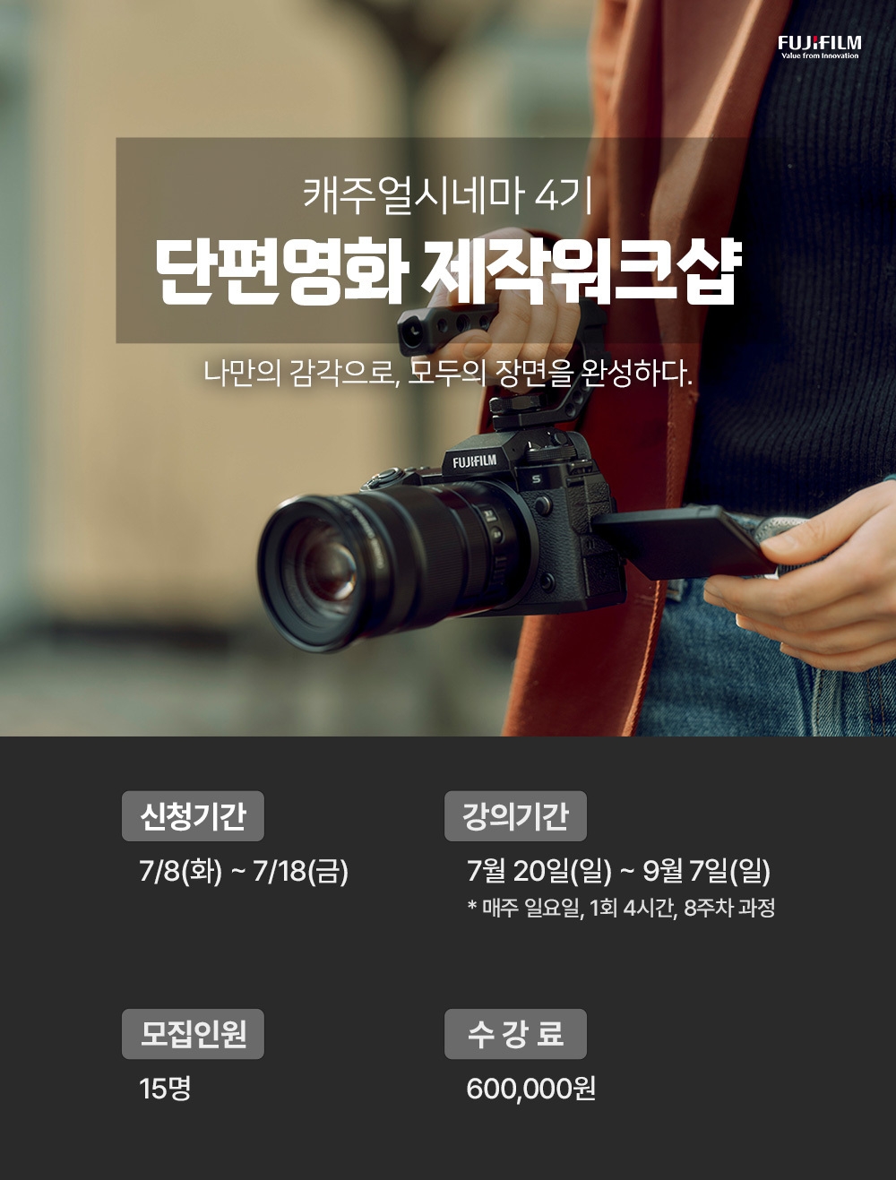 후지필름일렉트로닉이미징코리아(사장 임훈, 이하 후지필름 코리아)가 사진∙영상 문화 발전과 미래 인재 양성을 지원하는 캐주얼 시네마 워크샵 4기를 모집한다고 14일 밝혔다.