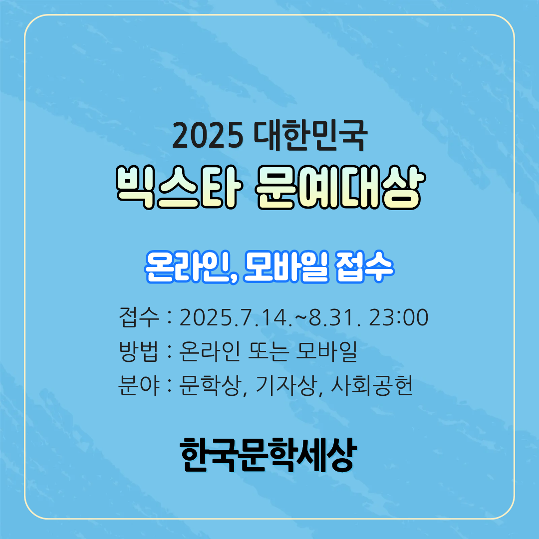 디지털 문학의 선두 주자 한국문학세상(회장 김영일)이 주관하는 『2025 대한민국 빅스타 문예대상』이 오는 7월 14일부터 8월 31일까지 온라인과 모바일을 통해 접수를 받는다.