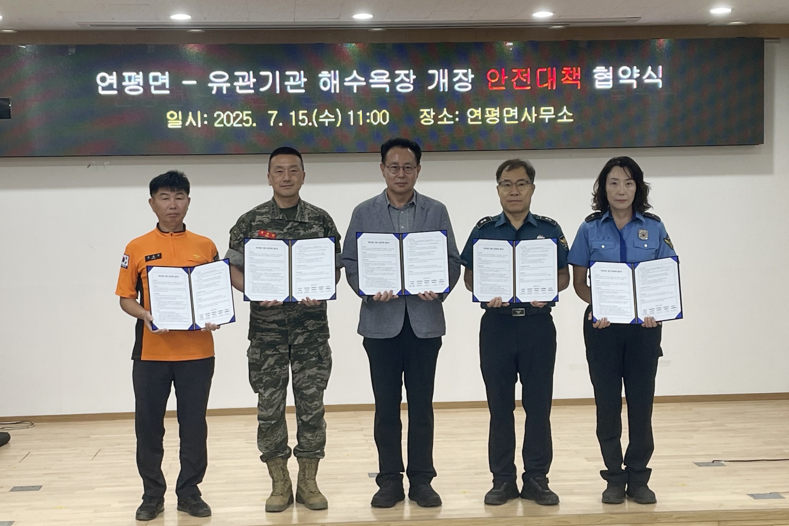 옹진군 연평면은 지난 15일, 연평면사무소에서 유관기관(해병대 연평부대, 연평파출소, 연평해경파출소, 연평119지역대)과 함께 안전하고 효율적인 해수욕장 운영과 지원을 위한 상호협력을 다지는‘연평면–유관기관 해수욕장 개장 안전대책 협약’을 체결했다.