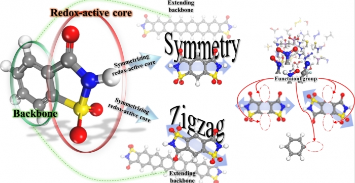 연구팀은 사카린 유도체의 레독스 활성 코어 구조를 대칭화하고 방향족 백본을 연장하는 한편, 다양한 기능기(functional group)를 도입해 통합 설계하는 방식으로, 기존 유기 전극에서는 관찰되기 어려운 ‘V자형’ 레독스 활성 변화 패턴을 구현해 냈다. 이 현상은 방향족 골격에서 나타나는 국소 유도 효과(local inductive effect)가 전자 전달을 촉진해 레독스 반응을 조절한 결과로 분석됐다. 이는 기존 퀴논계 유기 전극 소재와 달리, 충분히 확장된 고리형 구조가 전극의 사이클 안정성과 레독스 활성도를 동시에 높일 수 있음을 보여준다.