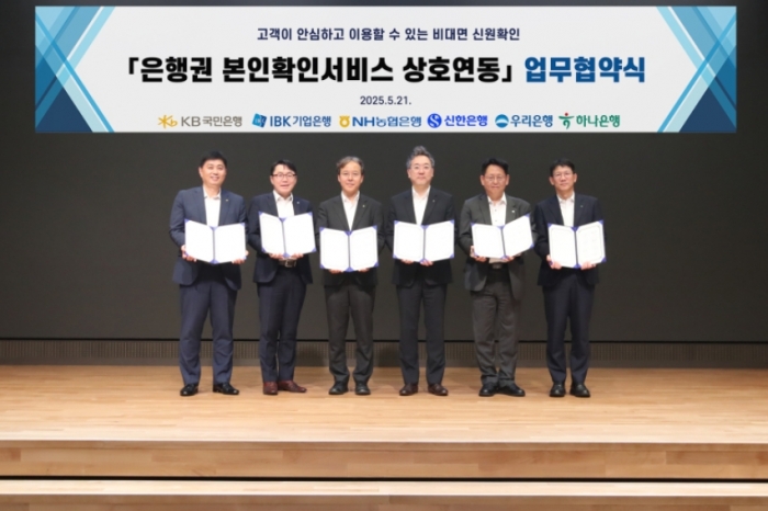 KB국민은행(은행장 이환주)은 21일 5개 은행(IBK기업은행·NH농협은행·신한은행·우리은행·하나은행)과 ‘은행권 본인확인 서비스 상호연동 업무협약’을 체결했다.